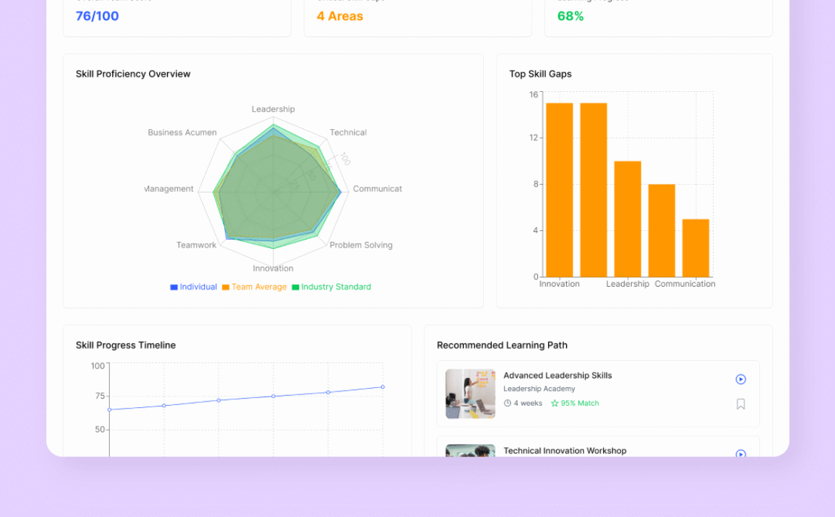 - Real-Time Dashboards: Visualize skill distributions, learning progress, and gap closures