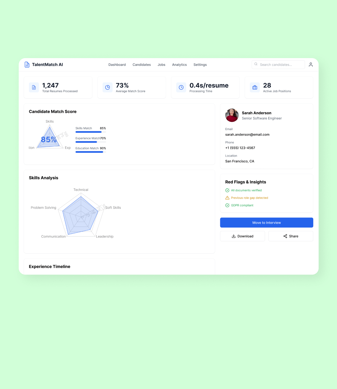 - Analytics Dashboard: Visualize talent pipelines, match scores, and hiring metrics in real time