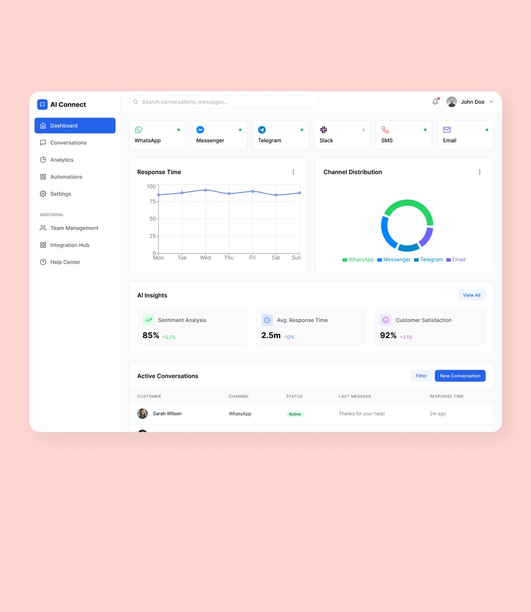 - Multi-channel Integration: WhatsApp, FB Messenger, Web Chat, SMS, Email, and more