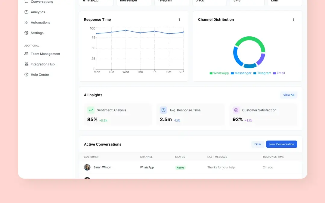 • Multi-channel Integration: WhatsApp, FB Messenger, Web Chat, SMS, Email, and more
