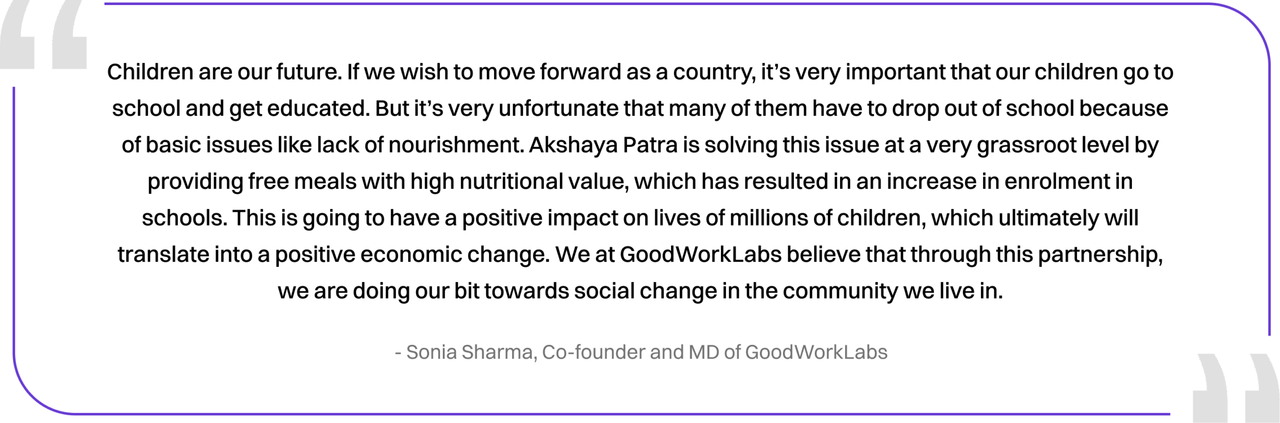 GoodWorkLabs has partnered with Akshaya Patra, an NGO that supports the “Mid-day meal” program launched by Government of India feeding over 1.4 million underprivileged students every day of the school year, in 20 locations, across 9 states in India. For children belonging to the weaker economic sections of society, a full meal, even once a day, is a strong incentive to stay in school. This program enables hunger free education and it has led to a significant rise in enrolment and attendance. This partnership has a simple but powerful mission – to change the trajectory of countless lives in our community.